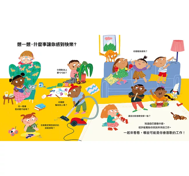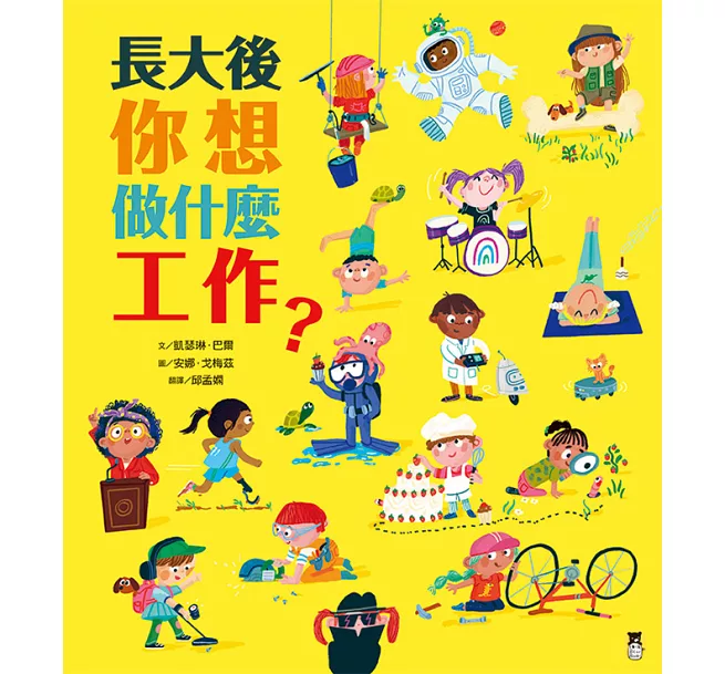 在孩子還沒找出真正喜歡的事物之前,不妨帶他多多認識這個世界,從中找到屬於自己的定位。「長大後你想做什麼工作」這本繪本,介紹了世界上84種工作,把適合的個性特質與工作接軌,列出職業的想像與分類,幫助孩子以自己的喜好與擅長的事物,找到自己未來的方向,可以當作孩子啟蒙未來的指導繪本;除了書中介紹的84種職業,也可以跟孩子討論有沒有其他遺漏的工作,孩子的創造力往往超乎大人的想像,或許能發明全一新的職業別喔!